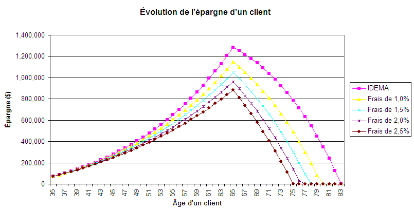Le graphique suivant poursuit les mêmes scénarios qu'au graphique ci-dessus en assumant que le client prend sa retraite à 65 ans et débute une période de décaissement. Le montant retiré de l’épargne est de 50 000 $ par année (indexé à l’inflation depuis l’âge de 35 ans), équivalent à 71 % du revenu avant la retraite. Les hypothèses de rendement sont inchangées à 5,0 % par année.